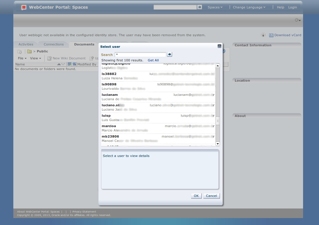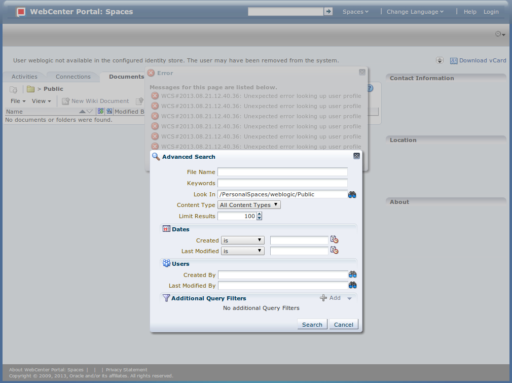 We have discovered an information exposure vulnerability in the Oracle WebCenter portal component in Oracle Fusion Middleware (versions 11.1.1.7 and 11.1.1.8) that leads to disclosure of user information. Specifically, an unauthenticated attacker can retrieve all information related to the users of the platform via a default user account of the Oracle WebCenter installation. This includes usernames, emails, phone numbers and files linked to the users’ profiles.