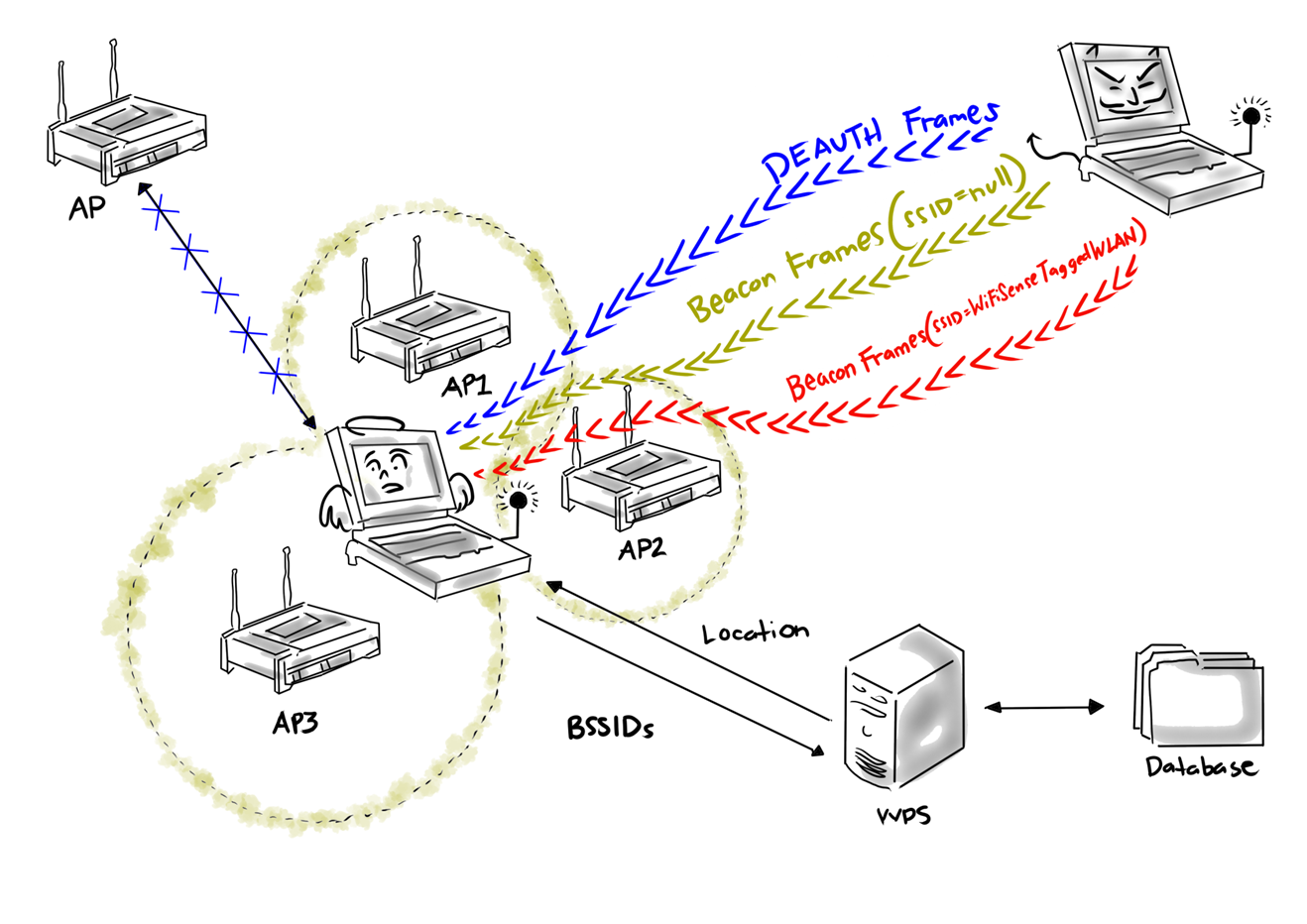 Behind the Windows Location Service mechanism lies a Wi-Fi Positioning System (WPS). Windows hosts send the BSSIDs (MAC addresses) of nearby Access Points to Microsoft’s WPS. The WPS queries a database that correlates location data with Access Point BSSIDs and returns the location of the host.