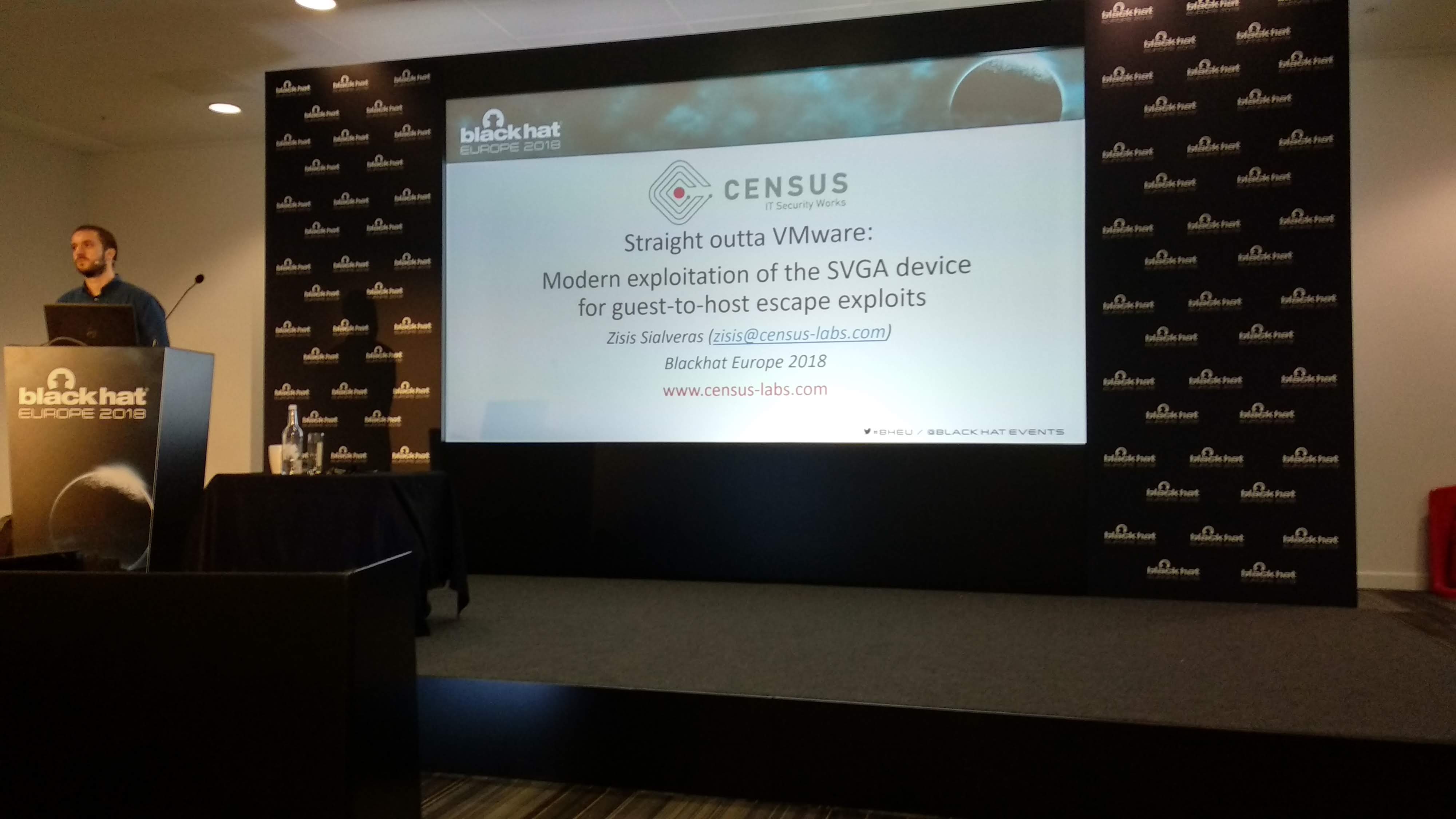 During the conferences I had the opportunity to present my research on modern exploitation of VMware Workstation virtualization software for guest-to-host escape exploits. My study is focused on the virtual graphics device (also known as SVGA device) of VMware Workstation; specifically, the one found in version 14.1.3.