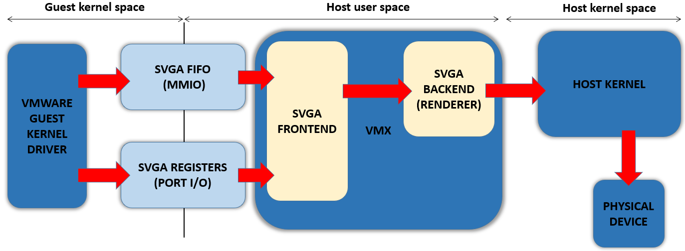 In my talk I gave a brief overview of the VMware architecture and the graphics pipeline. The host userland process of VMware (named vmware-vmx.exe) is responsible for the emulation of the virtual devices. This process will spawn a dedicated thread which will receive commands that are sent from the guest operating system. After that, I discussed about the SVGA3D protocol, which is the communication protocol between the guest and the frontend interface of the virtual graphics device and I pointed out the two available ways that guest users can send SVGA3D commands to the SVGA device.