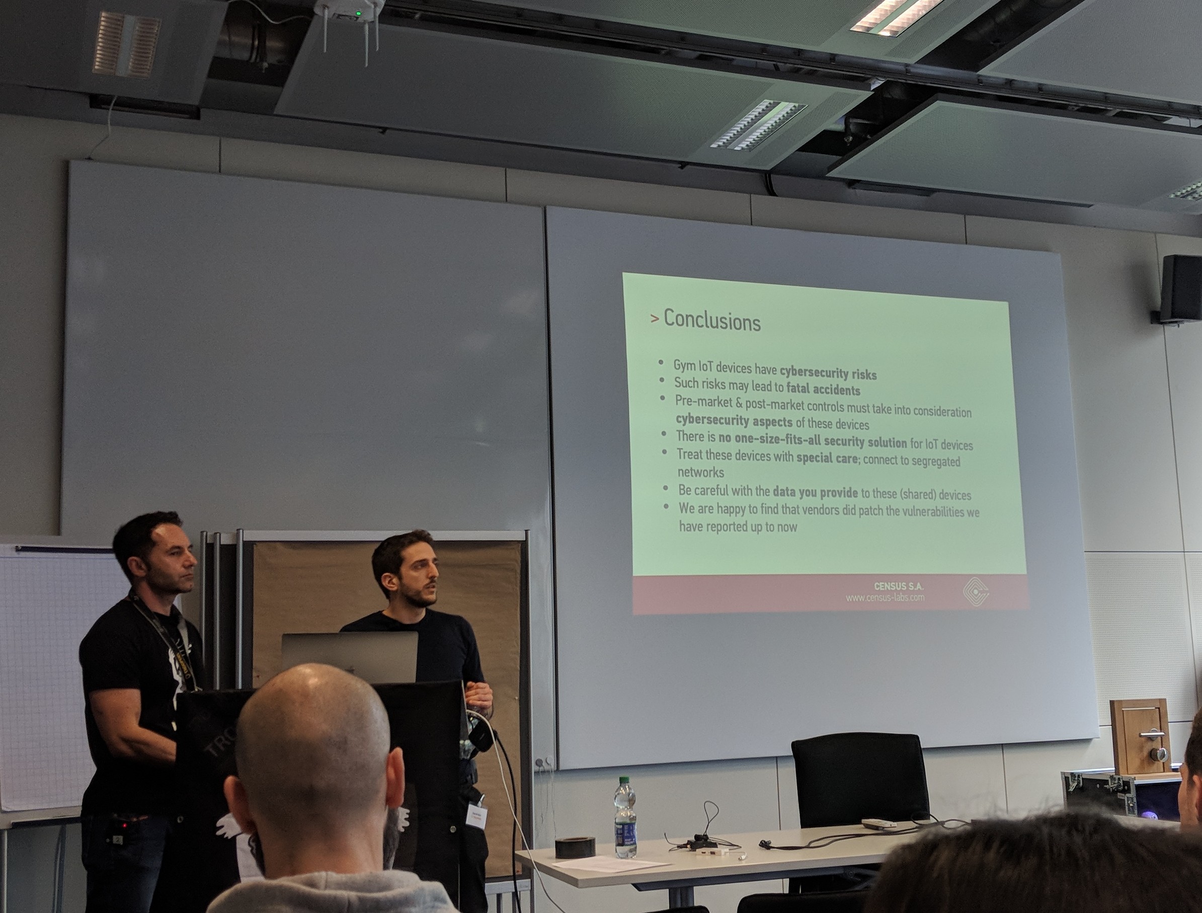 On March 18th 2019 myself and Dimitrios Valsamaras delivered a presentation on cybersecurity vulnerabilities of "smart" fitness equipment, entitled "Hitting the Gym: The Anatomy of a Killer Workout" at the TROOPERS 2019 conference (NGI track).