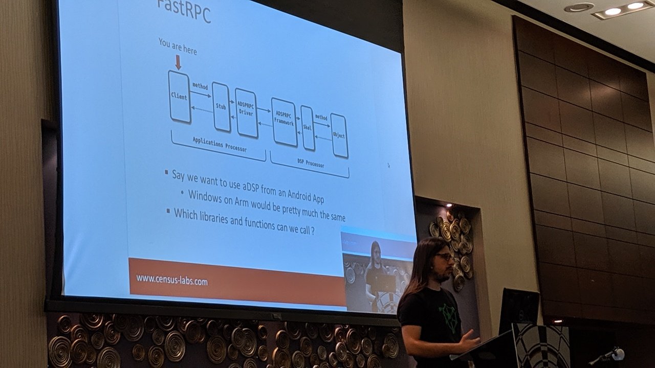 Most importantly, I had the pleasure to present our research on Qualcomm's aDSP which is a separate co-processor in modern Qualcomm chipsets. As evident by the name, it is used in DSP applications like audio/video decoding and machine learning. It uses the Hexagon architecture just like the baseband in Qualcomm chipsets. The memory accesses by aDSP in the system memory pass through an MPU that enforces memory permissions.